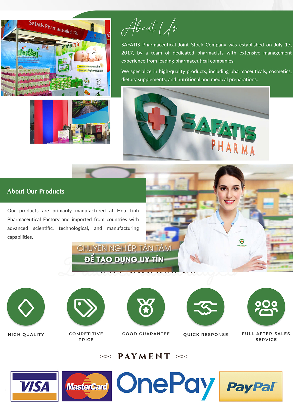 SAFATIS Pharmaceutical Joint Stock Company was established on July 17, 2017,by a team of dedicated pharmacists with extensive management experience from leading pharmaceutical companies.We specialize in high-quality products, including pharmaceuticals
